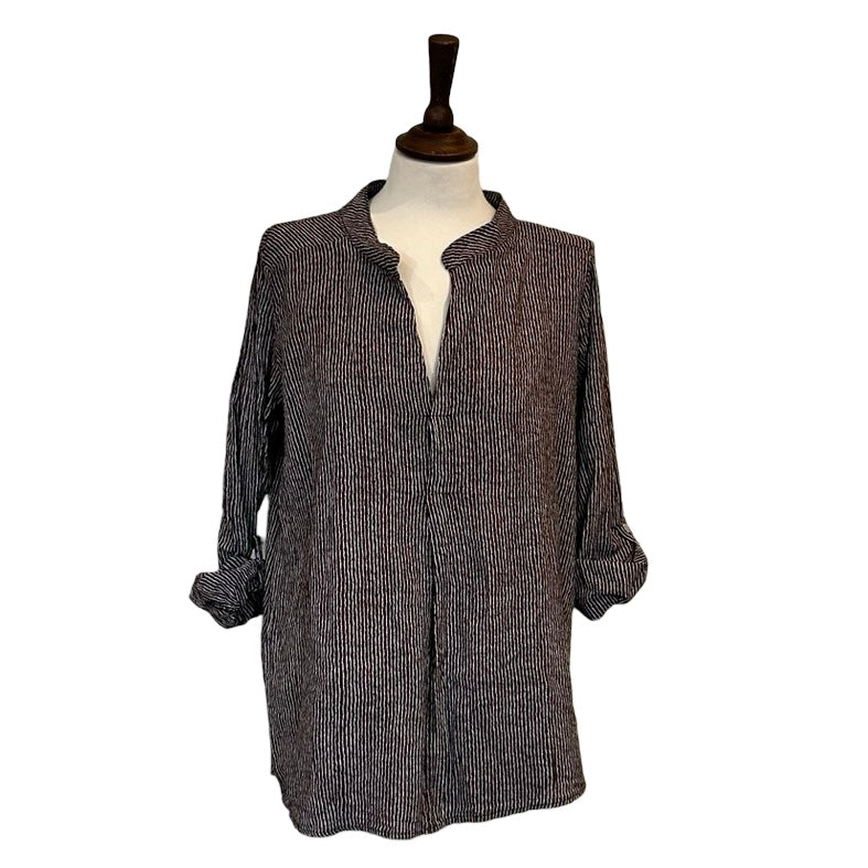 Beautiful light weight stripe shirt with roll up sleeves and v neck collar.