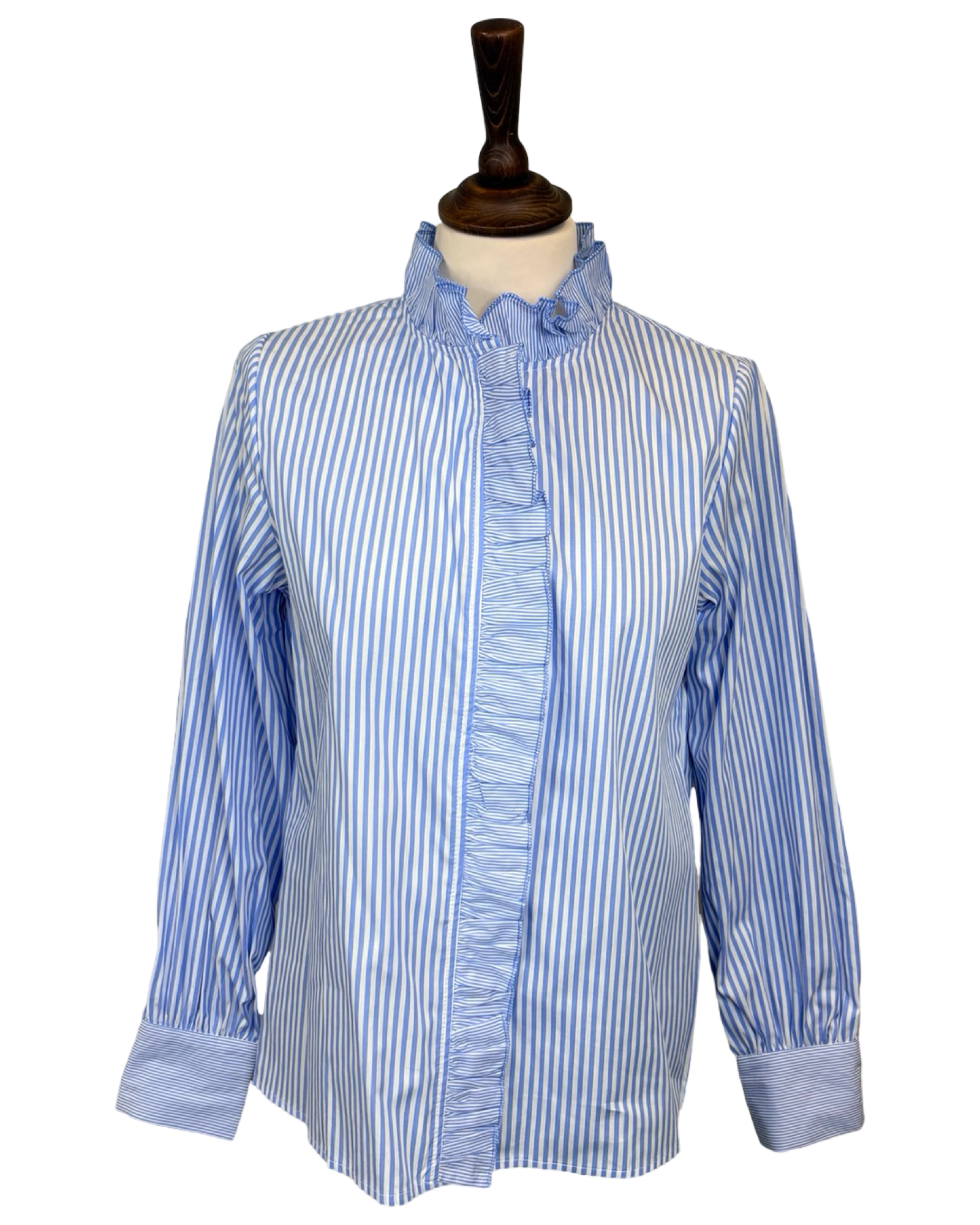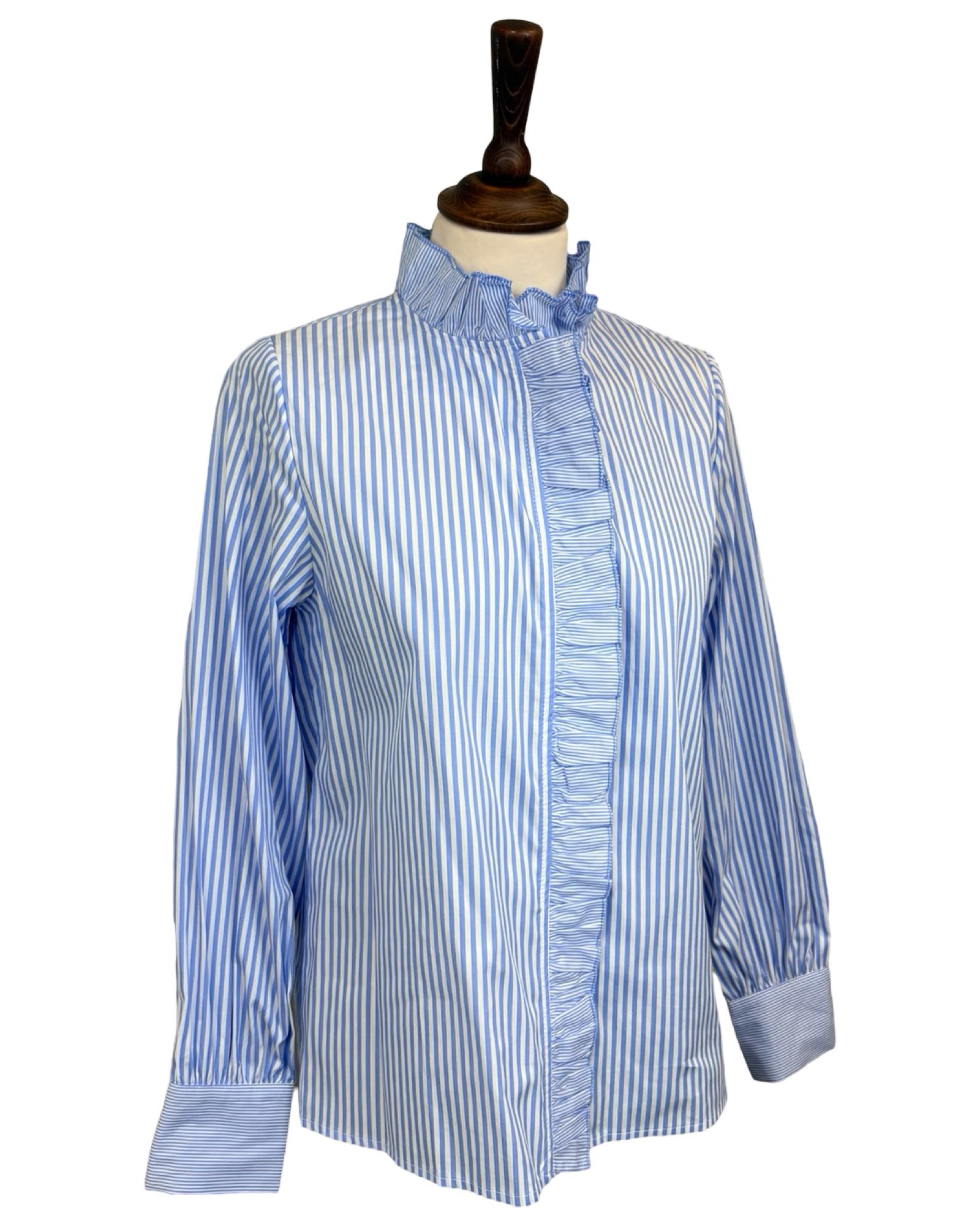 Stripe shirt with a frill collar and frill button front. Button cuffs and collar