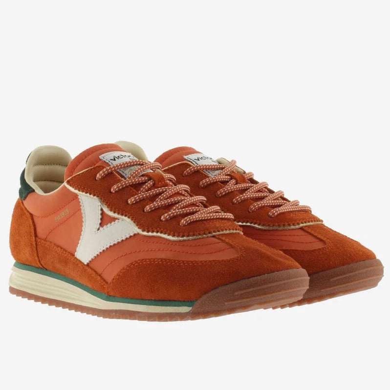 White unisex sneakers made in Spain from high-quality soft leather. They also carry the Sneakers for women made of nylon with tone-on-tone suede panels and synthetic details. Side V and heel piece with the brand logo in contrasting leather-effect colors. Closure with speckled round laces in tone. Two-tone sole and caramel serrated tread that provides better grip.